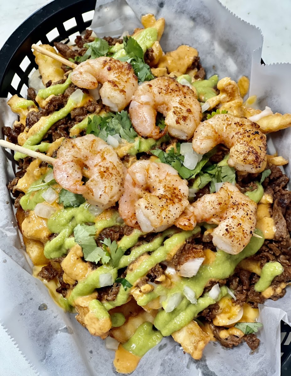 3 SHRIMP QUESO TACOS, WITH RICE AND BEANS.